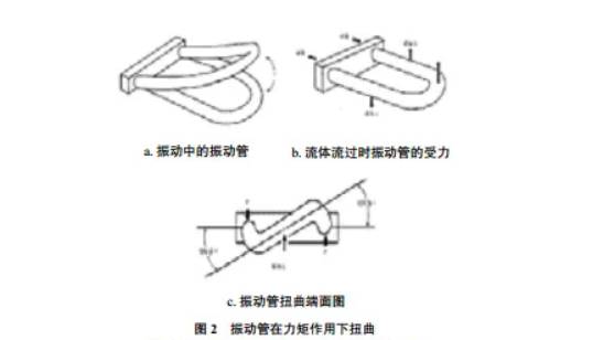 科里奥利质量流量计由传感器和变送器组成,变送器用于信号处理,两者之间通过专用的9 芯电缆连接。传感器的结构有直管,U 形管、Ω 型等多种形式,流体在流经 U 形管时,将产生一个科里奥利加速度,并以科里奥利力的形式反作用于U 形管。流体在 U 形管入口,出口两侧的流动方向相反,形成一个作用力矩,致使 U 形管发生扭曲,该扭角的大小与通过 U 形管的流体质量流量相关,通过电磁检测器将测量管的扭曲变成电信号,送入变送器作进一步处理。U 形管的两个开口端与管道连接,流体由一个端口流入,另一端口流出。在 U 形管顶部装有用于激发 U 形管振动的电磁装置,激发U 形管以中心为轴按固有的自振频率振动,自振方向垂直于 U 形管所在平面;流体流入 U 形管后,在沿管道流动时又随管道作垂直运动。