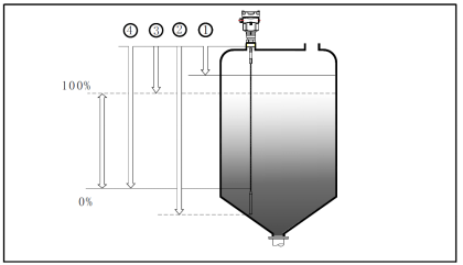 低强度电磁脉冲以纳秒级宽度被发射并沿着刚性或柔性的导体以光速行进,当脉冲接触到介质表面时被反射。反射信号被仪表接收,发射脉冲与接收脉冲的时间间隔与基准面到被测介质表面的距离成正比。通过测量发射与接收的时间间隔,来实现基准面至被测介质表面距离的测量。