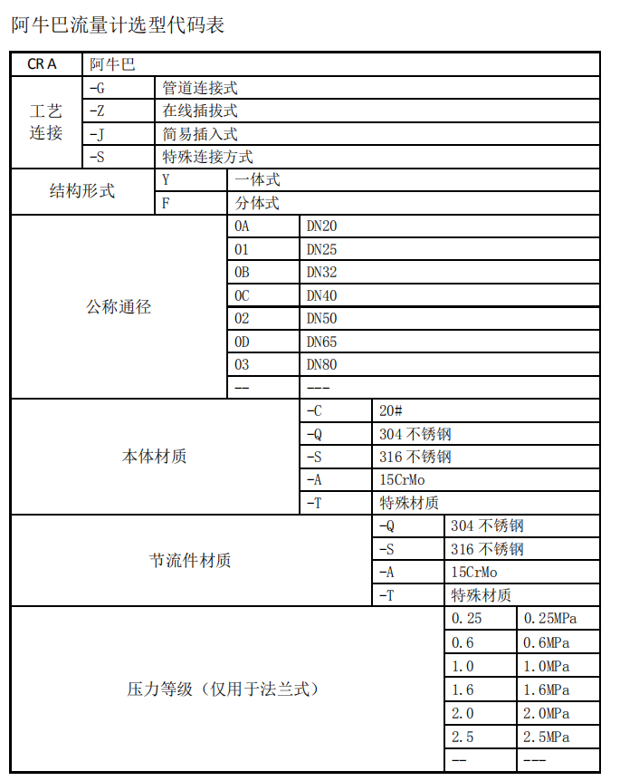 例:CR A -G Y 04 -C -Q 1.6    阿牛巴流量计,一体式管道连接,公称通径为DN100,本体材质为20#,节流件材质为304,压力等级1.6MPa。更多详情参数请咨询客服。