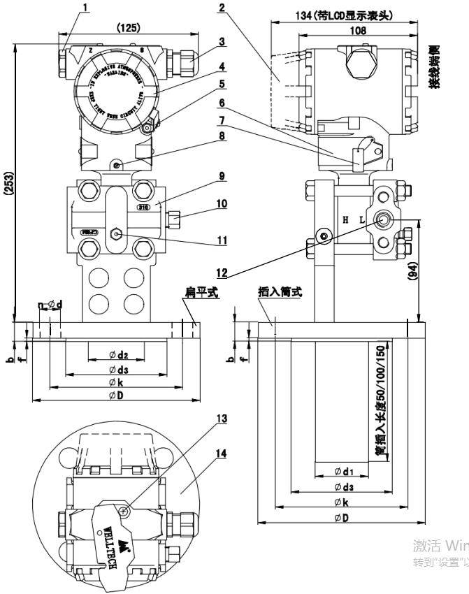 12.低压侧过程连接:NPT1/4 内螺纹, 法兰接口符合DIN19213