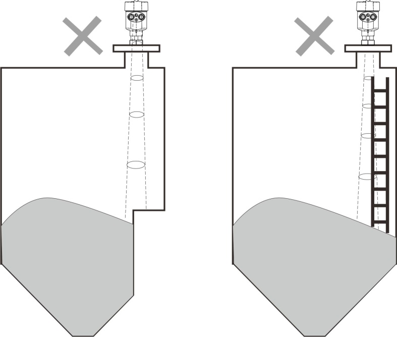 安装需要注意的两点:(1)对准目标料位,尽量垂直入射料位;(2)避免虚假回波。典型工况参见以下几点。波束范围内没有干扰物,如人梯,台阶。