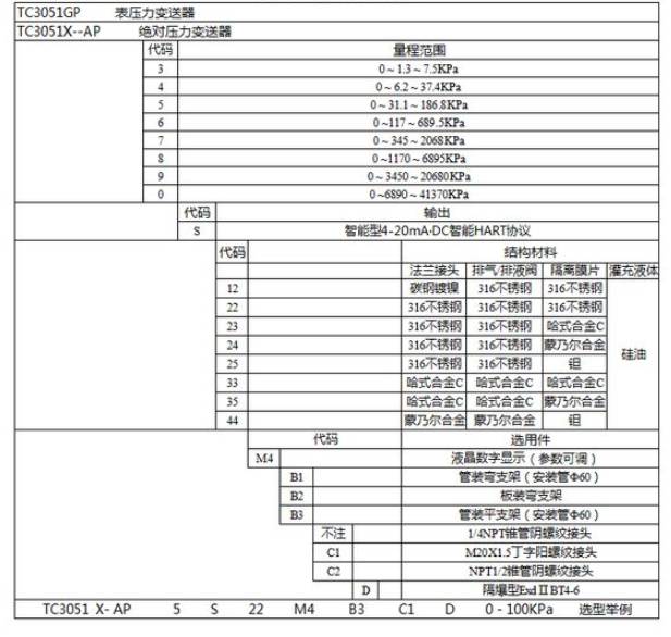 七、压力变送器选型表
